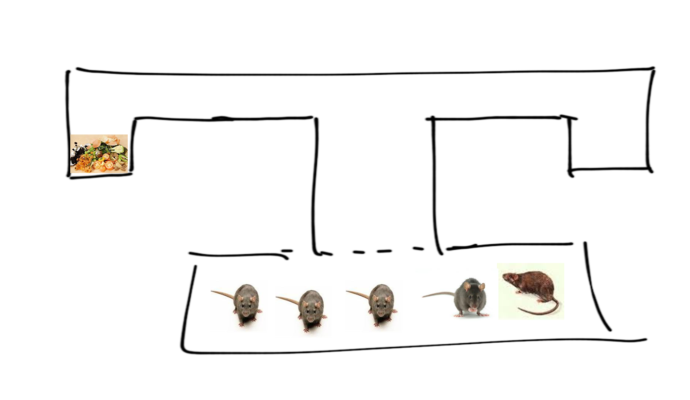 Al tientallen jaren geleden hebben ze een keer een experiment gedaan met ratjes. Een bovenaanzicht van de opstelling zie je hiernaast. Een stuk of tien ratjes zat in een ruimte, die was afgesloten met een hekje (de stippellijn). Het hekje gaf toegang tot een gang die splitste. Als je naar links ging stond er voedsel, als je naar rechts ging, was er niets. Eén keer per dag ging het hekje open. Na een paar dagen wisten de ratjes dat er links aan het eind van de gang eten stond. En na een paar dagen was het steeds hetzelfde ratje dat daar als eerste aankwam. En het was steeds hetzelfde ratje dat daar als tweede aankwam en hetzelfde ratje dat als derde aankwam.