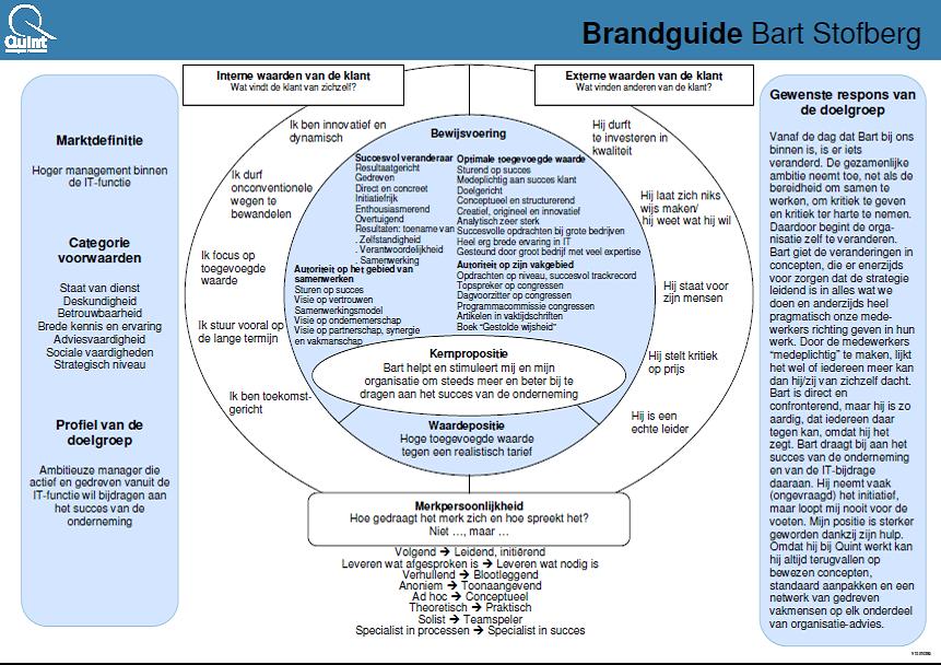 Iedere onderneming heeft een definitie van zijn merk nodig, in eerste instantie als onderdeel van strategie en beleid, maar vooral ook om daarmee vast te kunnen stellen welke eisen dat stelt aan de ondernemingsvoering. De keuze in de PSV-driehoek heeft natuurlijk grote gevolgen voor het merk, net als de gekozen strategie. Een mooie manier om het merk vast te stellen en te communiceren is een brandguide. In een brandguide is de essentie van het merk vastgelegd. Het maken van een brandguide hoeft al met al niet meer dan een paar dagen te kosten, één voor de leden van het management team en twee voor de analist die de brandguide maakt. En vervolgens twee voor degene die er een mooi plaatje van moet maken. De brandguide moet organisatiebreed worden gecommuniceerd en moet natuurlijk op het intranet staan.
