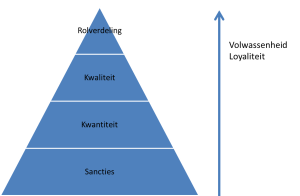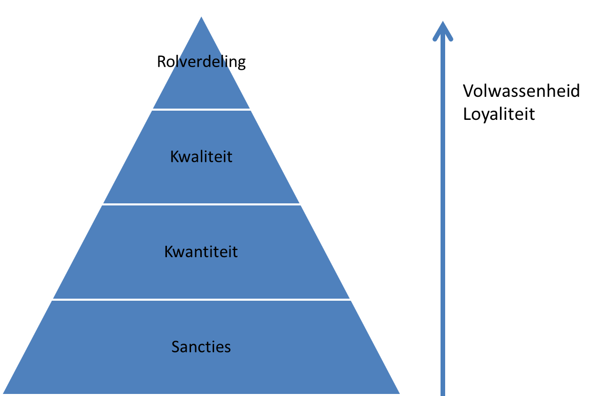 Op deze manier hebben we nu een piramide geconstrueerd: rolverdeling – kwaliteit – kwantiteit – sancties. Van boven naar beneden wordt de bijdrage aan het succes steeds specifieker, en steeds dwingender. De piramide geeft vier niveau’s weer, vier niveau’s om de samenwerking vorm te geven. De drijfveren van een individu om bij te dragen aan het succes kun je hiermee in vier soorten verdelen: Een rol invullen, kwaliteit leveren, kwantiteit leveren of sanctie nastreven of vermijden. Hoe hoger de volwassenheid en de loyaliteit naar het gezamenlijk succes, hoe hoger de drijfveren van het individu in de piramide: